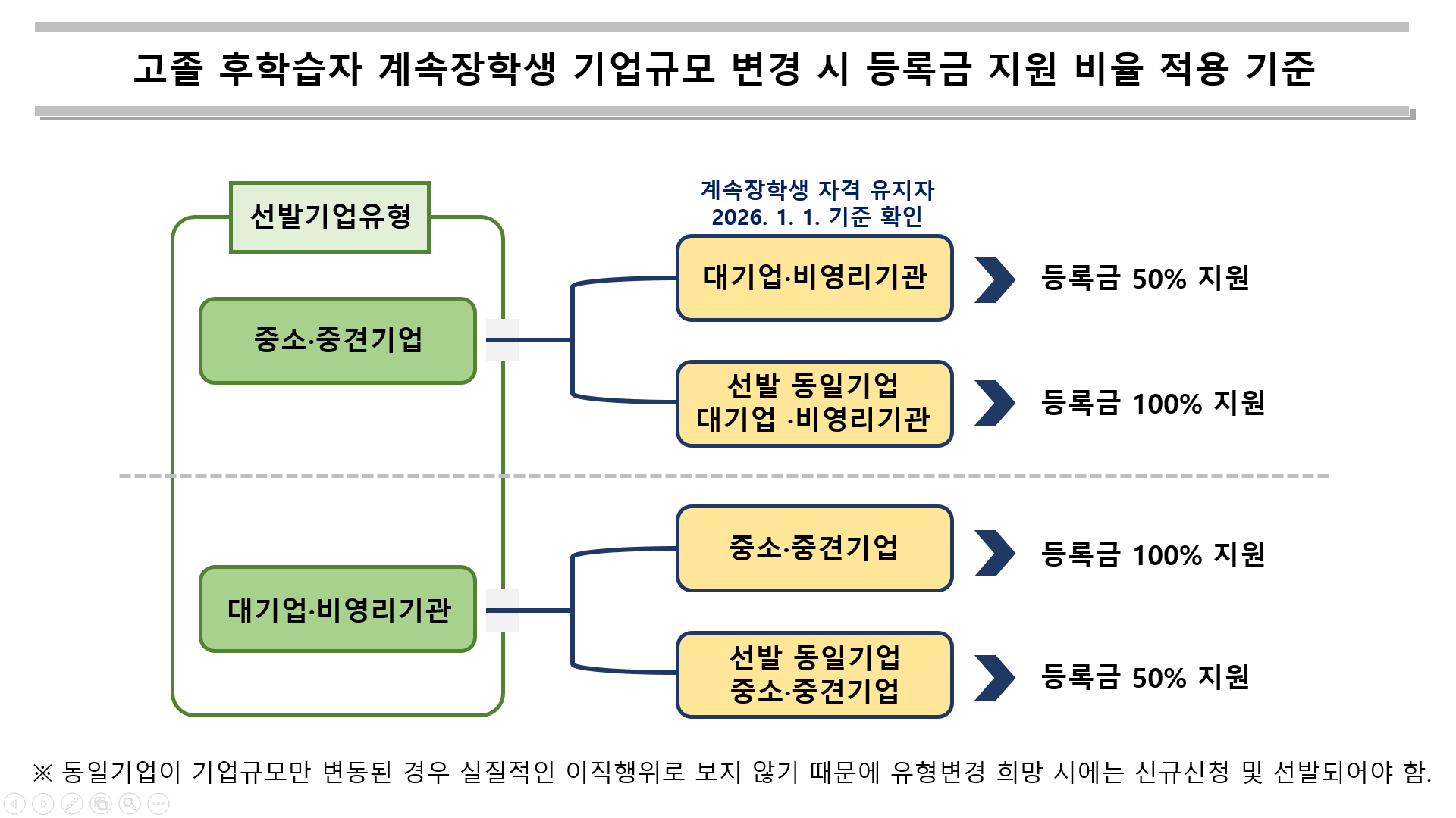 ② 기업규모: 이직 시 기업규모 변동되는 경우 선발유형 변경(자격유지) - (중소·중견기업 ☞ 대기업·비영리기관 이직) 해당 학기 등록금 50% 지원 - (대기업·비영리기관 ☞ 중소·중견기업 이직) 해당 학기 등록금 100% 지원 - 단, 사업자번호 등을 기준으로 최초 선발 재직기업과 현재 재직기업이 동일하나, 기업규모가 변동된 경우는 최초 선발유형이 유지되며 동일기업 재직 중임에도 유형 변경을 희망할 시 자격포기 후 신규장학생 신청 및 선발되어야 함. (최대 선발가능횟수 2번)