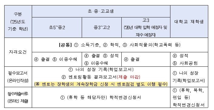 ④ 출결 - 직전 학년* 미인정 결석 (’25년 초5~6) 5일 미만, (’25년 중1~고3) 10일 미만 * 직전 학년이란 계속장학금 신청 시 입력하는 학년(진학 예정 학년)의 전년도 학년을 의미 (ex> 2025년 중학교 3학년일 경우, 2026년 계속장학금 신청 시 고1(진학예정)로 신청하므로, 직전학년인 중3 출결 심사) ※ 미인정 지각·조퇴·결과 합산 3회당 결석 1일로 간주 ⑤ 성적 - ’25년 중3~고2(예비 고1~고3)만 심사 * 직전 학년이란 계속장학금 신청 시 입력하는 학년(진학 예정 학년)의 전년도 학년을 의미